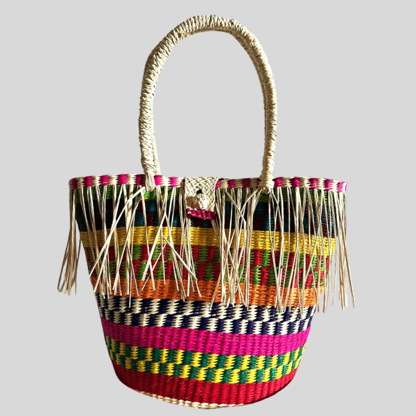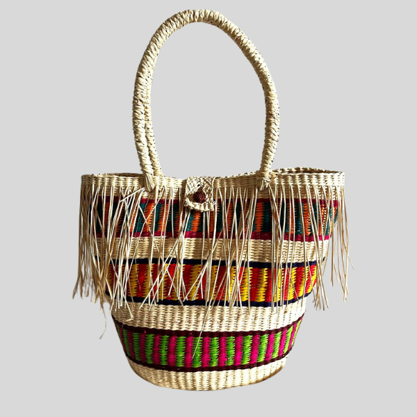 hecho a mano con paja toquilla. Diseño bohemio con flecos. Colores variados. Producción responsable y única.